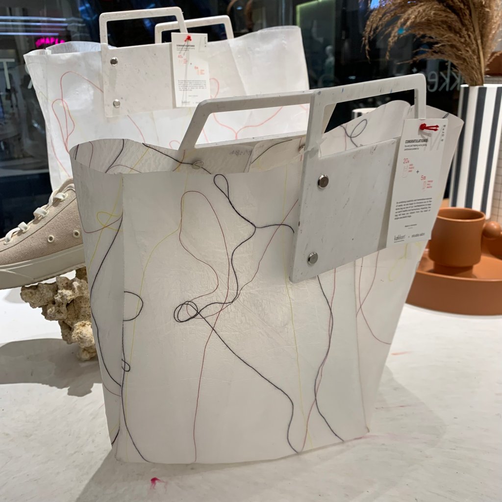 Studio Aliri sees the potential to bring a new life to the materials by examining various compositions to merge the two different waste characters. Using curated colour waste threads from the textile manufacturer combined with the pressed white plastic bags create translucent surfaces that allow light to pass through and to be integrated with the existing ambience of Lumine. Studio Aliri aspires to convey the beauty of recycled waste.